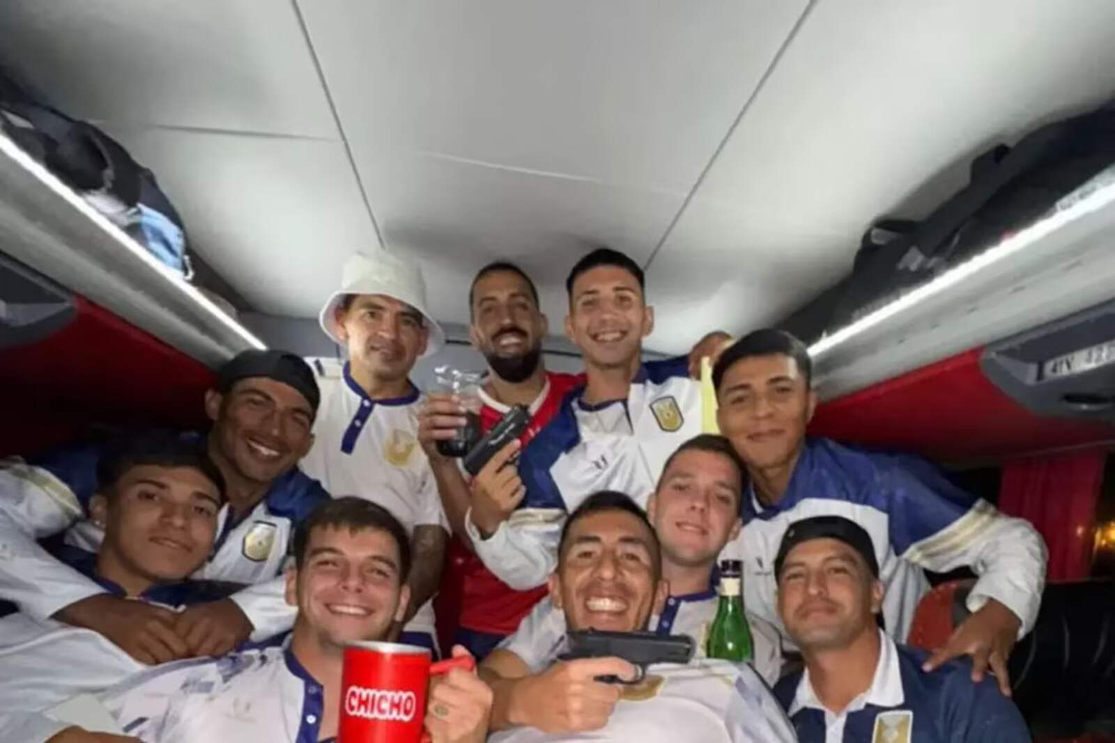 La foto fue tomada dentro del micro que trasladaba al plantel tras el triunfo. En ella se observa a varios futbolistas celebrando con bebidas alcohólicas y exhibiendo dos pistolas, lo que generó repudio y obligó al club a salir a aclarar la situación públicamente.