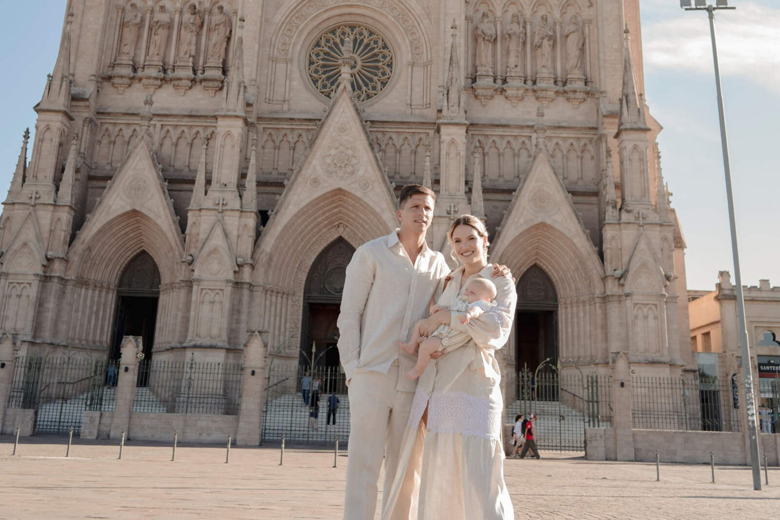 Desde las primeras horas de la tarde, la llegada de la familia al histórico templo anticipó la carga simbólica del evento. Uno de los registros más emotivos muestra a Carolina Baldini, madre de Gianluca, sosteniendo al pequeño Faustino en brazos junto a su hijo. Ambos eligieron looks en tonos claros, acordes al clima cálido y al espíritu de la ceremonia. El pasillo central de la basílica, con su arquitectura neogótica y el característico piso de mosaicos rojizos, fue el escenario elegido para las primeras postales familiares.