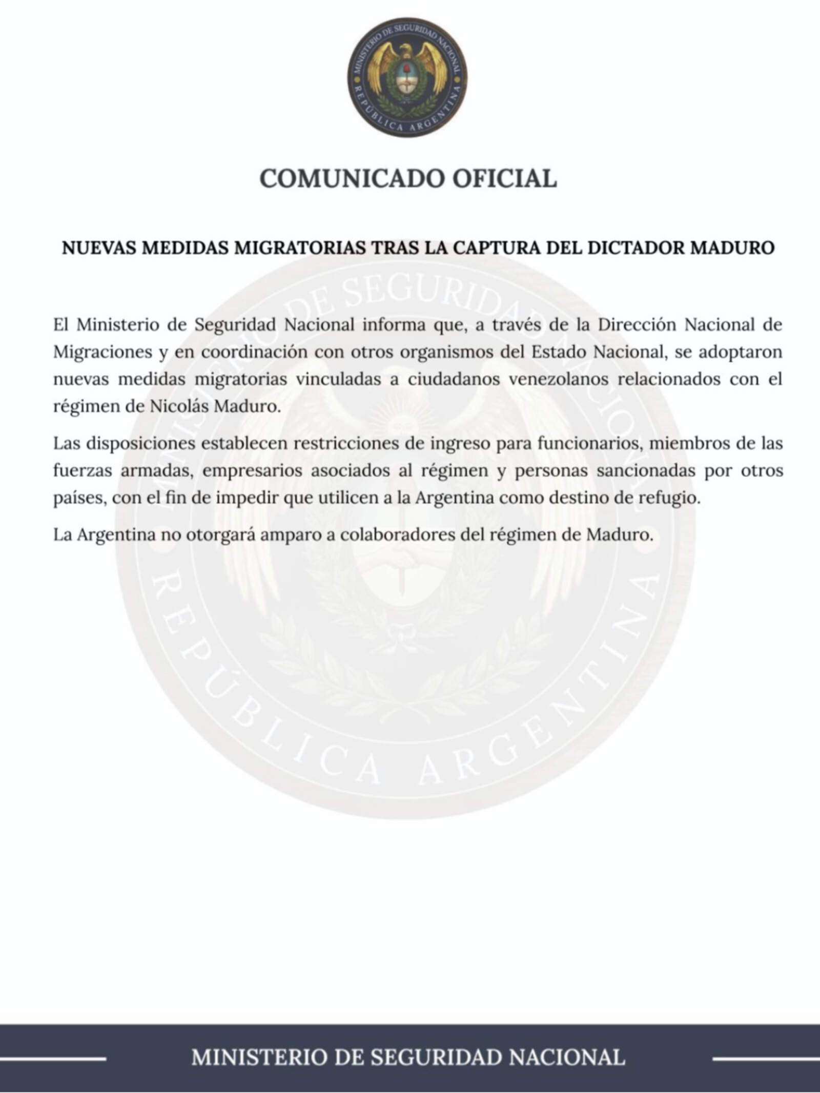Minutes after the announcement, the Ministry of Security publicly backed the decision and released the same official statement. From the ministry, officials emphasized that "Argentina won't be a refuge for collaborators of the regime of Venezuelan dictator Nicolás Maduro", in line with the stance adopted by Casa Rosada.